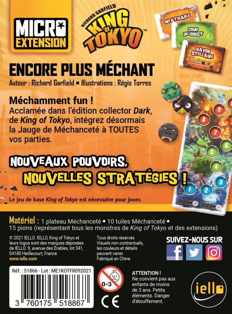 Cette extension apporte à King of Tokyo de nouveaux pouvoirs et de nouvelles stratégies grâce à un nouveau plateau de jeu: le plateau Méchanceté, intégrée initialement dans l’édition collector Dark de King of Tokyo.