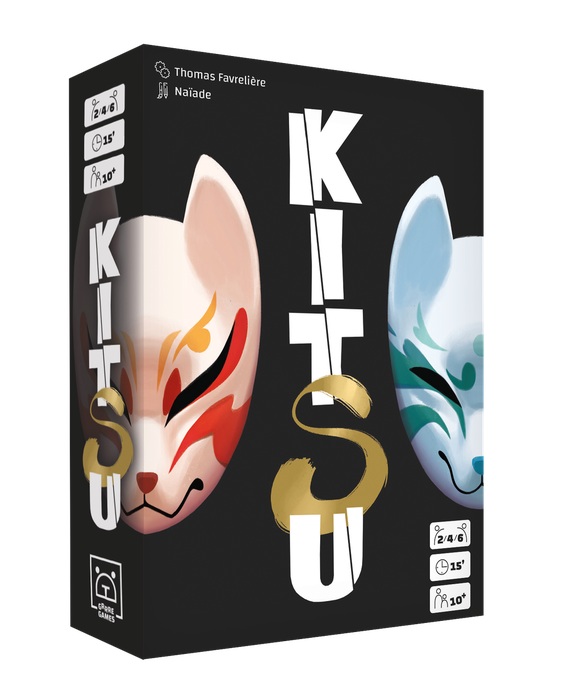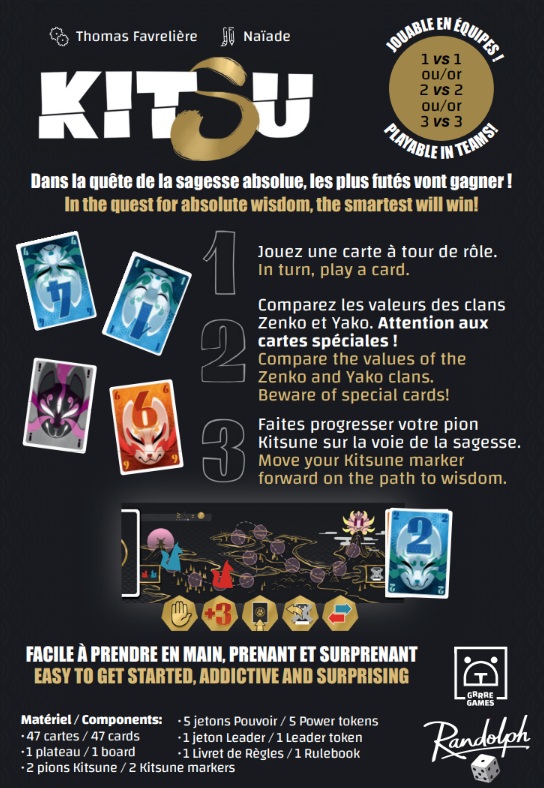 Contenu: 1 règle de jeu, 2 pions Kitsune, 1 plateau Sagesse, 5 jetons Pouvoir, 30 cartes Kitsu, 2 cartes de mise en place, 12 cartes Clan (6 bleues, 6 orange), 1 jeton Leader, 3 cartes Victoire de manche.