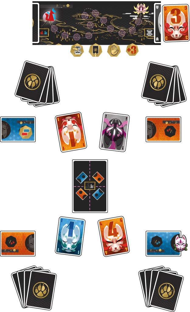 Que vous jouiez seul ou en équipe, associez vos cartes pour faire avancer votre Kitsune sur la piste de la Sagesse. Les Kitsune sont répartis en deux clans : Zenko (cartes bleues) et Yako (cartes orange). Dès le début de la partie, un clan vous sera attribué, mais pour l’emporter, vous devrez utiliser à la fois les cartes de votre propre clan et celles du clan adverse.