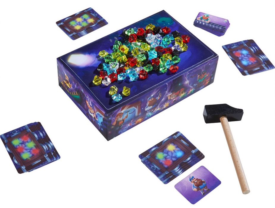 Contenu: 16 grandes cartes « wagonnet » (de 4 couleurs), 9 petites cartes de mission, 1 petite carte « premier joueur », 1 marteau, 90 pierres précieuses (10 blanches et 16 de chacune des autres couleurs : bleu, vert, jaune, rouge et noir), 1 tapis de jeu autocollant, 1 fond de boîte, 1 dé de couleur (qui sert dans la variante pour joueurs expérimentés), 1 règle du jeu.