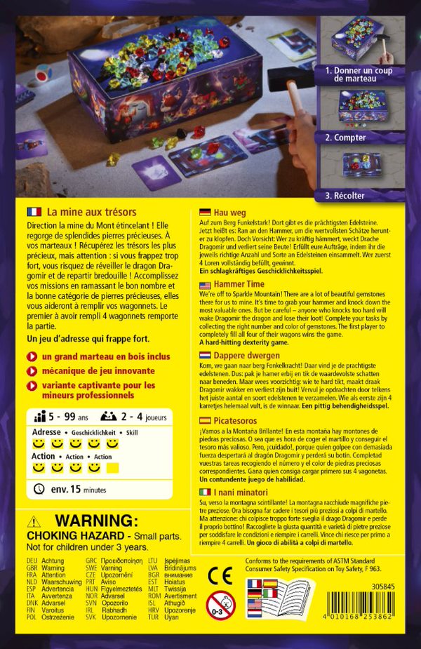 En frappant avec le marteau sur la boîte, vous accomplissez des missions en récupérant le bon nombre de pierres précieuses de la bonne catégorie. Ces missions vous aident à remplir vous wagonnets de joyaux. Mais attention, car s’ils frappent trop fort, ils risquent de réveiller le dragon Dragomir et de repartir bredouille ! Le premier à avoir rempli 4 wagonnets remporte la partie.