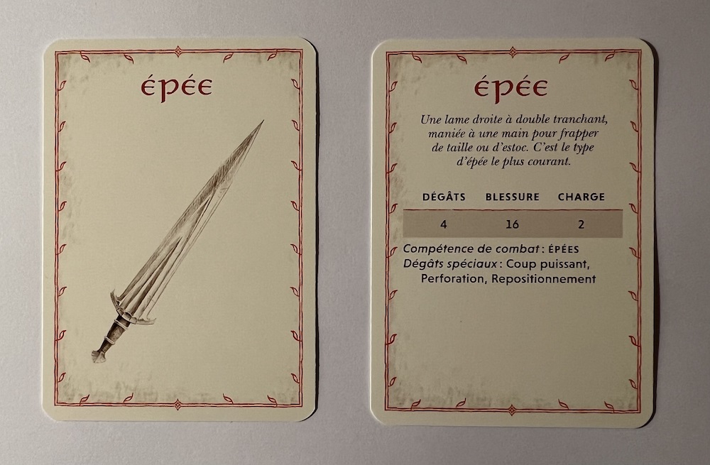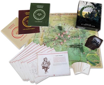 Contenu: Un livret de règles de 24 pages, Un livret d’aventures de 32 pages, Un livret décrivant la Comté de 52 pages, Huit feuilles de personnage pré-tirés recto-verso, Une grande carte recto/verso représentant la Comté et l’Ériador, 30 cartes Attirail de guerre, présentant armes et armures, Six cartes de Rôle/Position, recto-verso, Un set de dés : 2 dés du Destin à 12 faces et 6 dés de Maîtrise à 6 faces.