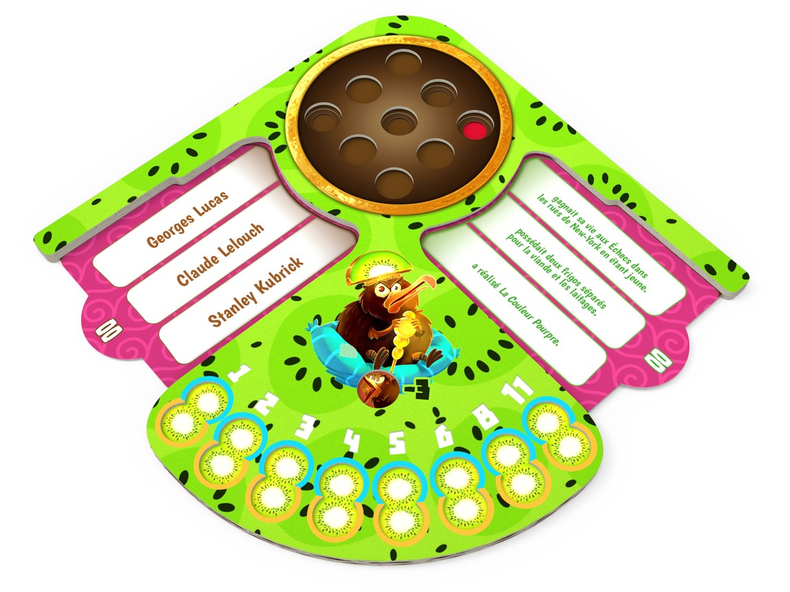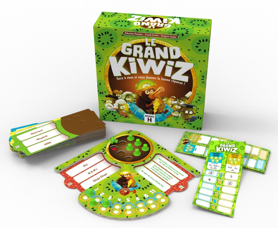 Contenu: 156 fiches Question, 1 plateau de jeu, 9 jetons Kiwiz, 1 bloc de score, 1 livret de règles.
