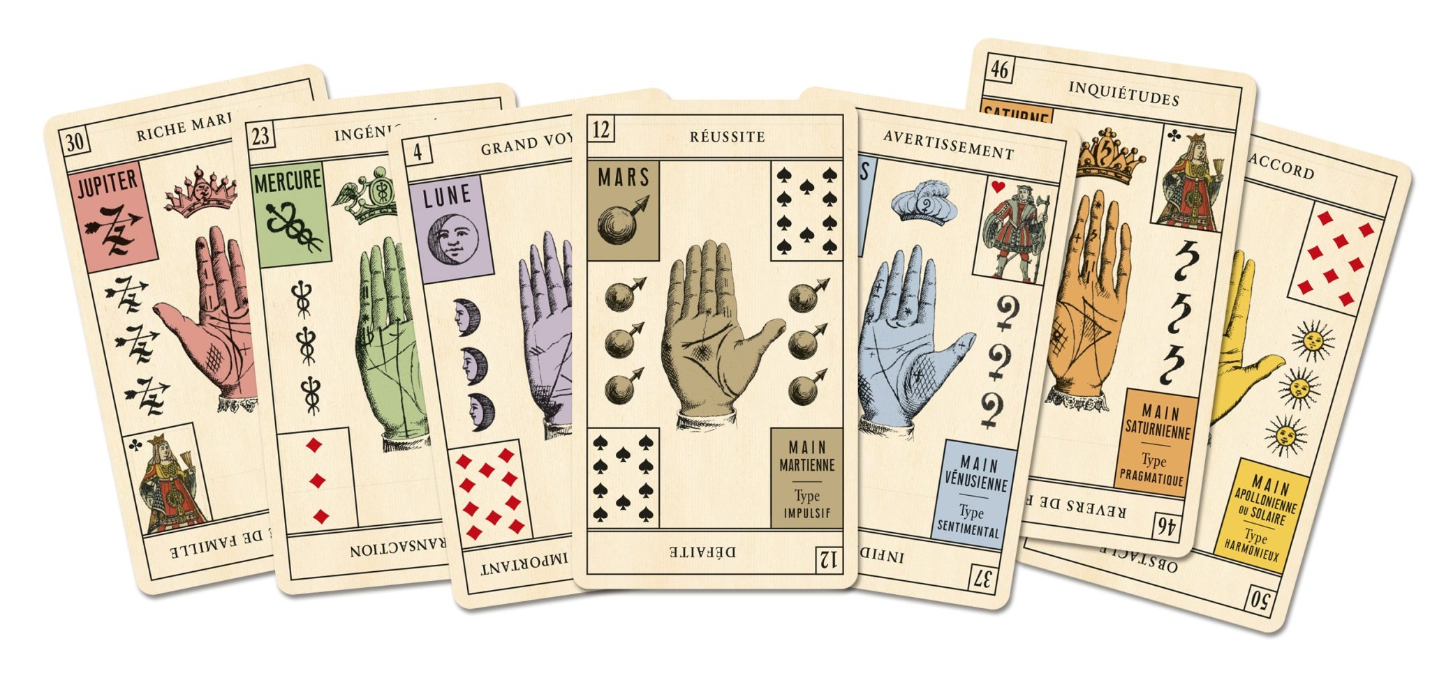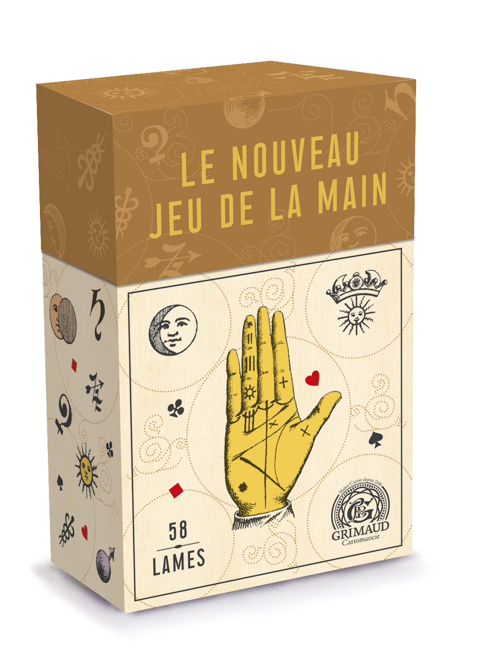 Créé par Adèle Moreau, célèbre cartomancienne du XIXe siècle et élève de Mlle Lenormand, le Jeu de la Main compile trois disciplines en 58 lames : chiromancie, astrologie planétaire et cartomancie.
