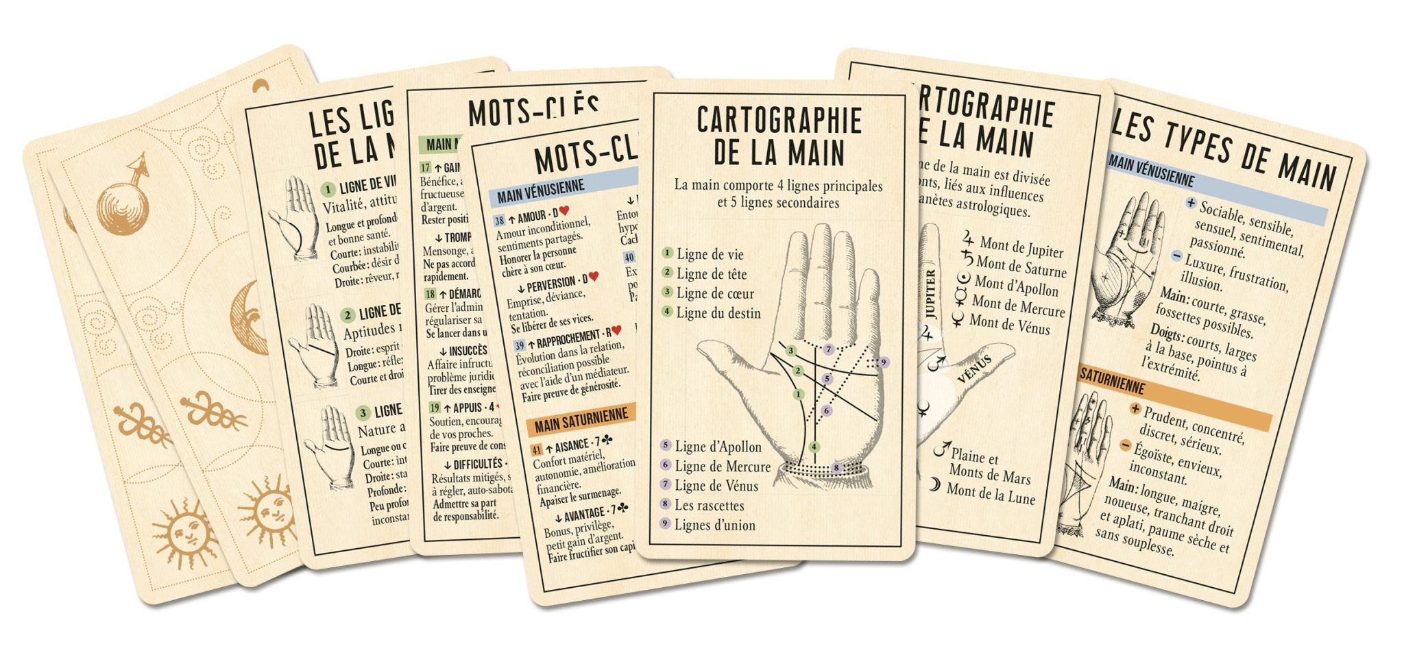 Coffret de 84 cartes comprenant un jeu de 58 lames, des fiches d’initiation à la chiromancie, des fiches mot-clé du jeu, des tirages et une vidéo explicative du jeu.