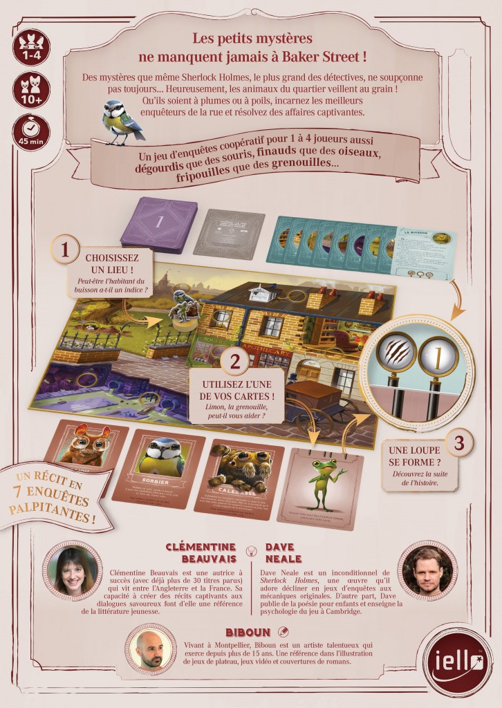 Les Animaux de Baker Street est un jeu d’enquête coopérative pour 1 à 4 joueurs au 19e siècle dans un Londres aussi mignon que captivant. Il va vous falloir enquêter sur des mystères que même Sherlock Holmes, le plus grand des détectives, ne soupçonne pas toujours… Heureusement vous les animaux du quartier veillez au grain !