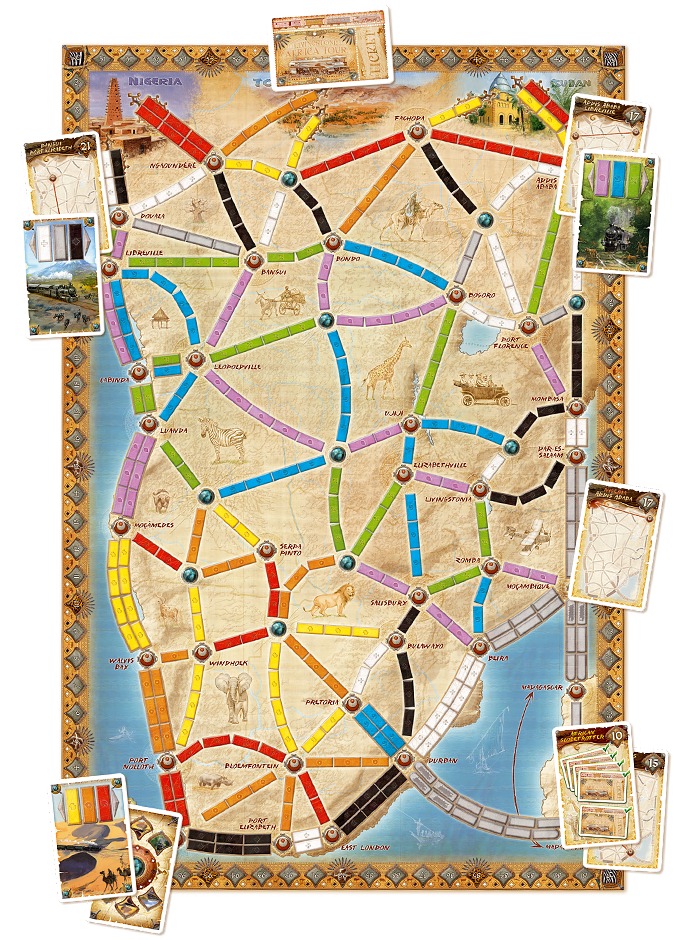 Aventurez-vous au cœur de l’Afrique et bâtissez votre réseau ferré à travers déserts et savanes pour atteindre les villages les plus reculés du continent. Saurez-vous tirer parti de votre connaissance du terrain pour construire les routes les plus rentables, ou bien jouerez-vous sur la vitesse pour empêcher vos concurrents de parvenir à leur fins ?