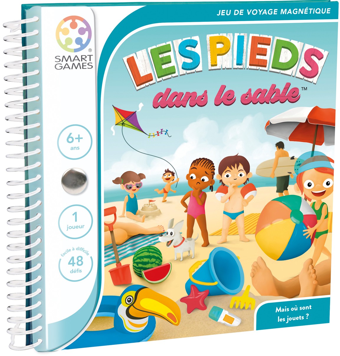 Inclus: Un livret de jeu magnétique, cinq tuiles de jeu aimantées représentant des vacanciers et 48 défis avec les solutions.