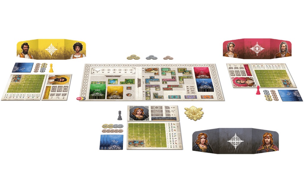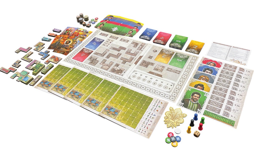 Contenu: 1 plateau principal, 5 plateaux de joueur, 5 plateaux de Principauté, 30 tuiles Bâtiment, 18 tuiles Paysage, 12 tuiles Liberté, 6 tuiles Architecte, 7 tuiles Saltimbanque, 5 écrans de joueur, 81 cartes, 6 grandes cartes, 58 pièces en carton, 5 pions, 6 marqueurs circulaires, 5 jetons 50/100, 1 marqueur Premier Joueur, 1 dé, 1 livret de règles, 5 aides de jeu.