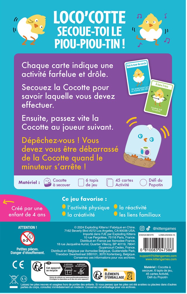Secouez la poule pour révéler votre activité, puis exécutez-la rapidement avant de passer la poule au joueur suivant. Ne vous faites pas prendre en train de tenir la poule lorsque le chronomètre s’éteint !