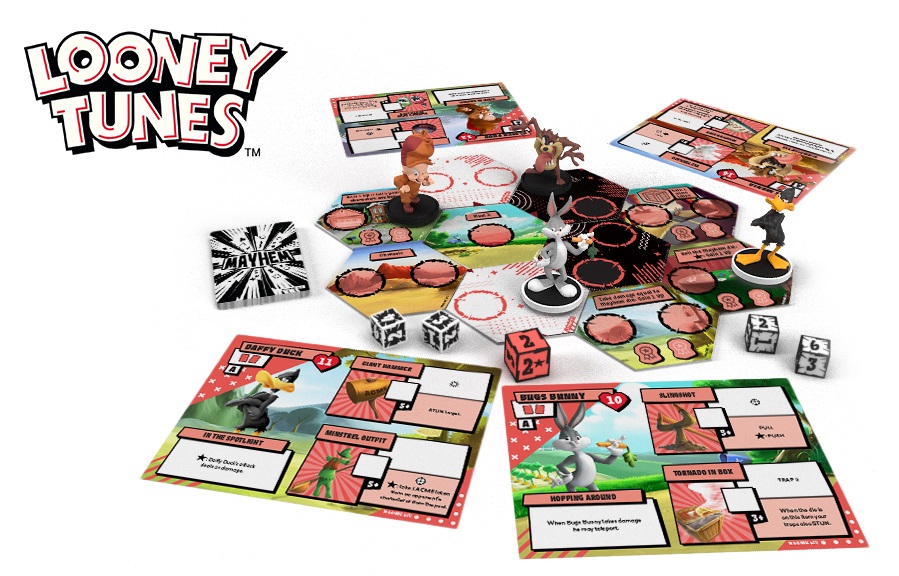 Looney Tunes Mayhem is built around the « Mayhem System », a system for character vs. character team-based combat in which the most direct method for a team to gain VP is by KOing their opponents. Characters use items and powers to battle the enemy team, with battle damage changing each round based on the mayhem die. When a character is KOed, they are removed from the board and their opponent gains VPs, with the KOed character returning to play next round.