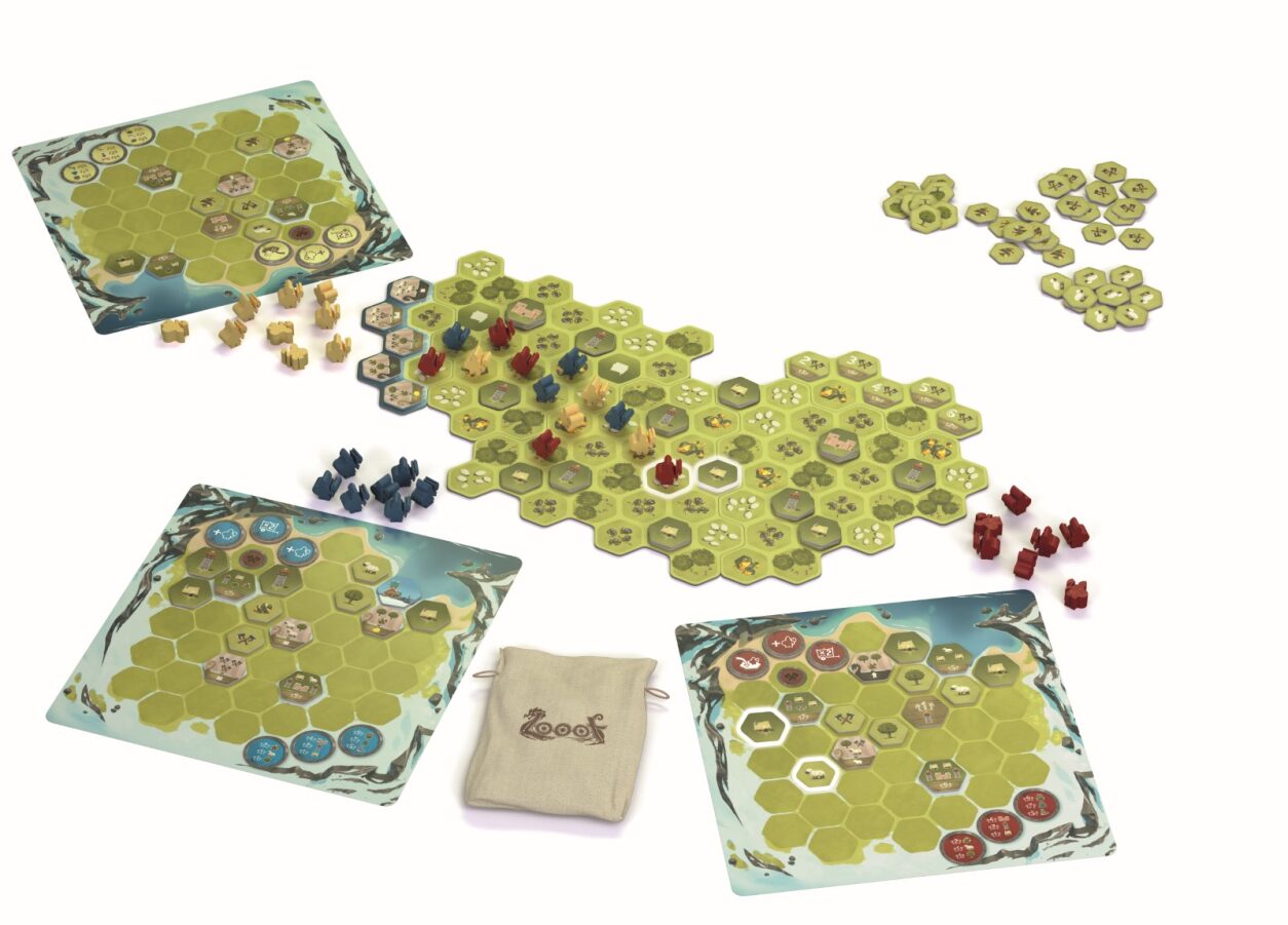 Contenu: 4 plateau fjord, 1 tuile Mer, 1 tuile Trophée, 4 tuiles Territoire, 43 bâtiments, 12 boucliers, 15 chantiers, 30 drakkars, 5 trophées, 90 ressources, 52 vikings, 1 bloc de score et 1 sac, 1 règle du jeu.