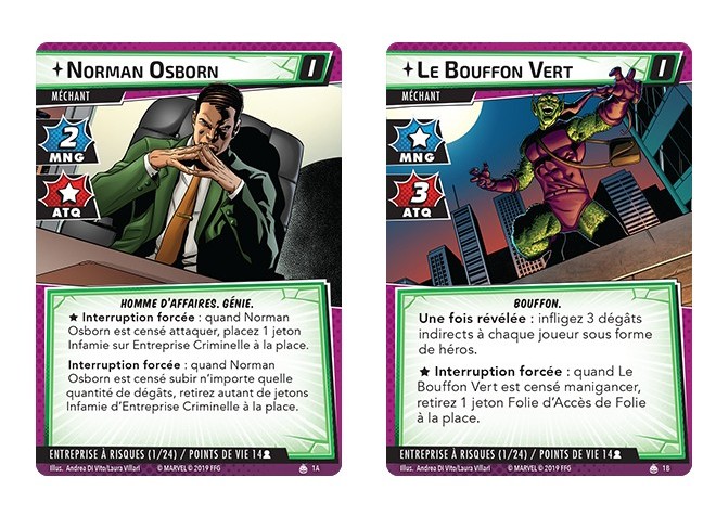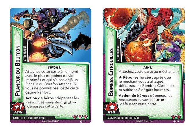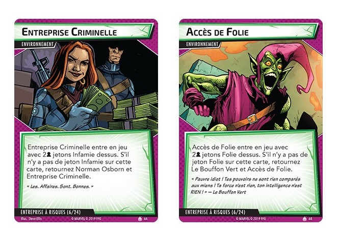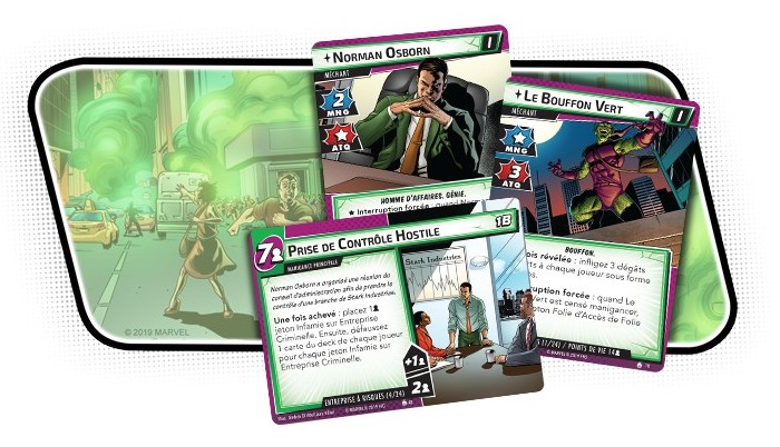 Le Bouffon Vert est une extension de 78 nouvelles cartes pour Marvel Champions : Le Jeu de Cartes qui comprend deux scénarios et quatre sets de rencontre modulaires. Dans le premier scénario, empêchez Norman Osborn d’utiliser la technologie Stark pour construire un armement surpuissant. Dans le deuxième scénario, sauvez New York du Bouffon Vert et de son armée de bouffons !