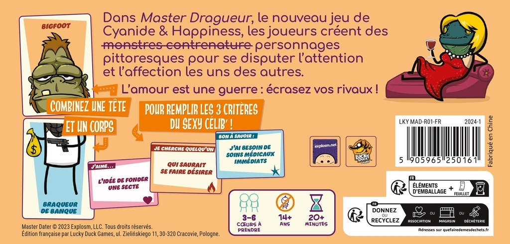 Dans Master Dragueur, le jeu de drague qui met la pagaille, les joueurs jouent à tour de rôle le rôle du célibataire sexy. Les autres joueurs combinent alors les cartes de tête et de corps pour créer des rendez-vous ratés afin de satisfaire les trois intérêts inhabituels du célibataire.