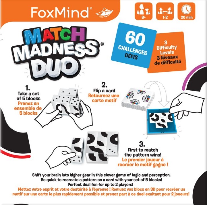 Vivez l’expérience de Match Madness à un niveau plus relevé! Duo est un jeu de rapidité pour les vifs d’esprits! Remuez vos blocs en 3D pour recréer un motif sur une carte le plus rapidement possible et prenez part à ce duel exaltant pour 2 joueurs! Le jeu comprend 60 cartes défis avec 3 niveaux de difficulé.