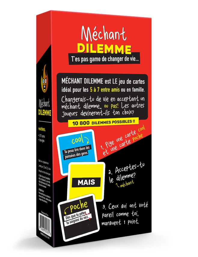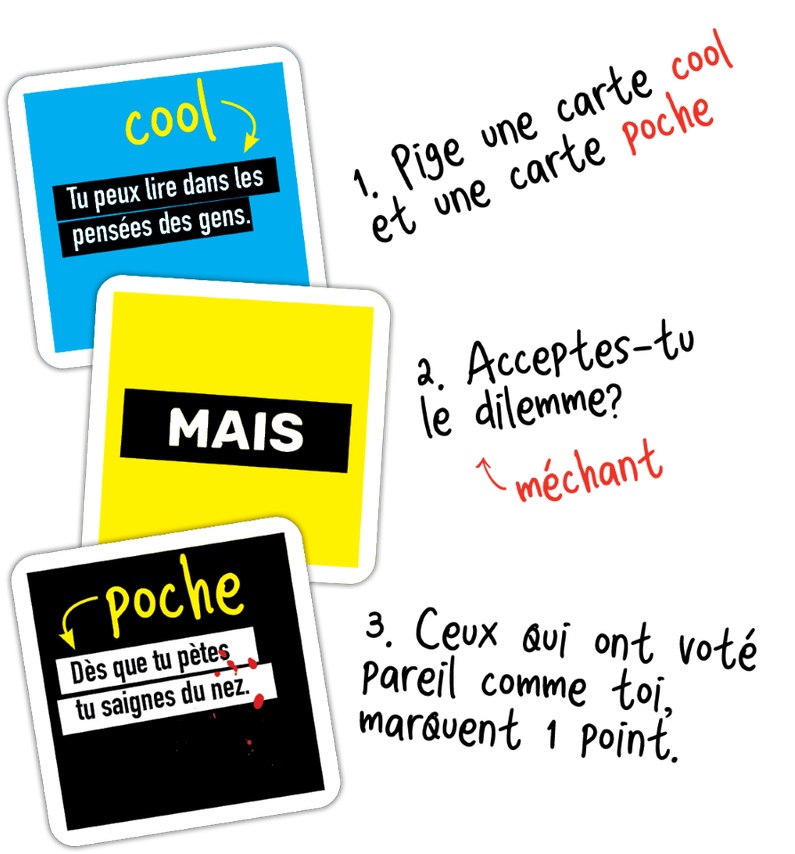• 90 cartes cool et 120 cartes poches pour un total de 10 800 dilemmes possibles !