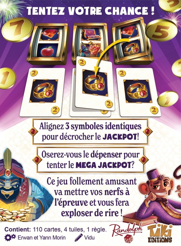 Mega Jackpot est un jeu d’ambiance et de prise de risque pour 2 à 4 joueurs. Dans ce jeu de cartes rapide et accessible, vous devrez faire preuve d’audace pour parvenir au maximum de gains. Retrouvez un peu de calcul, un peu de chance et beaucoup de frisson dans ce jeu de société à l’esprit casino !