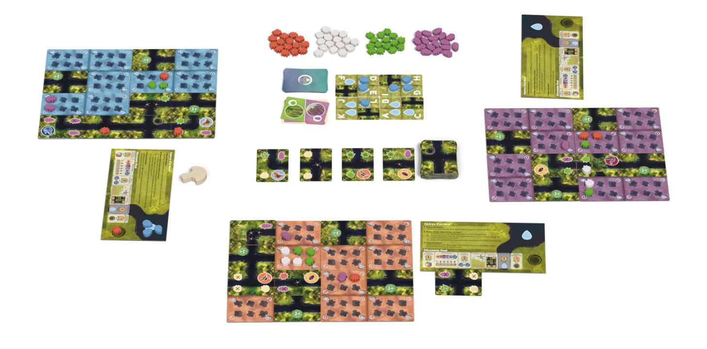 Contenu: 4 plateaux Joueur, 16 tuiles Tourbière, 60 cartes Marécage, 14 cartes Plante, 4 cartes Eau, 1 bloc de Score, 88 pions Plante (22 par type), 12 pions Eau, 1 pion Champignon, 1 règle du jeu.