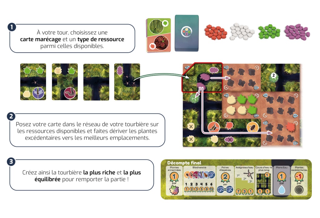 Dans Moorland, créez votre réseau de canaux judicieusement afin de faire ruisseler dans votre tourbière les ressources que vous récupérez à chaque tour. Biodiversité, paires d’animaux identiques, nombre d’araignées d’eau, chemin d’eau le plus long : tous ces éléments sont à prendre en compte pour marquer le plus de points et remporter la victoire !