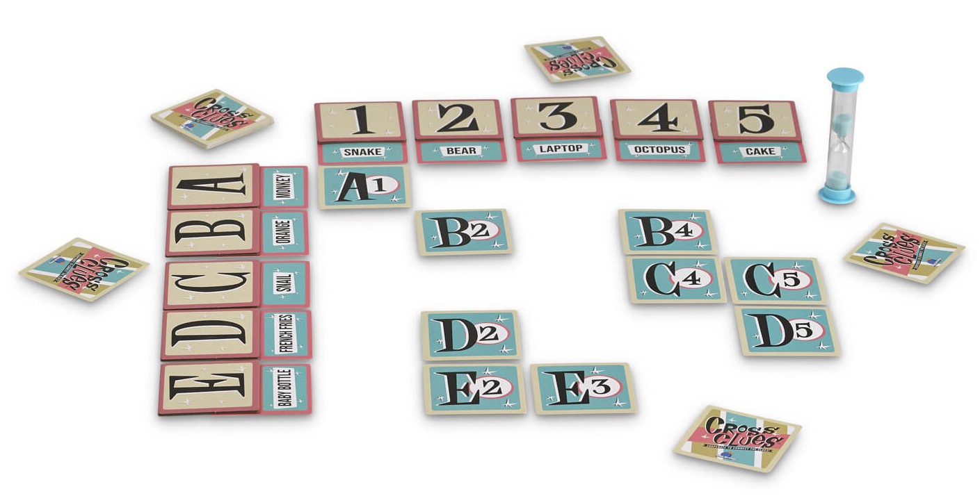 Contenu : 10 tuiles Positions, 25 cartes Coordonnées, 50 cartes Mots, 1 sablier de 5 Minutes, 1 règle de jeu.