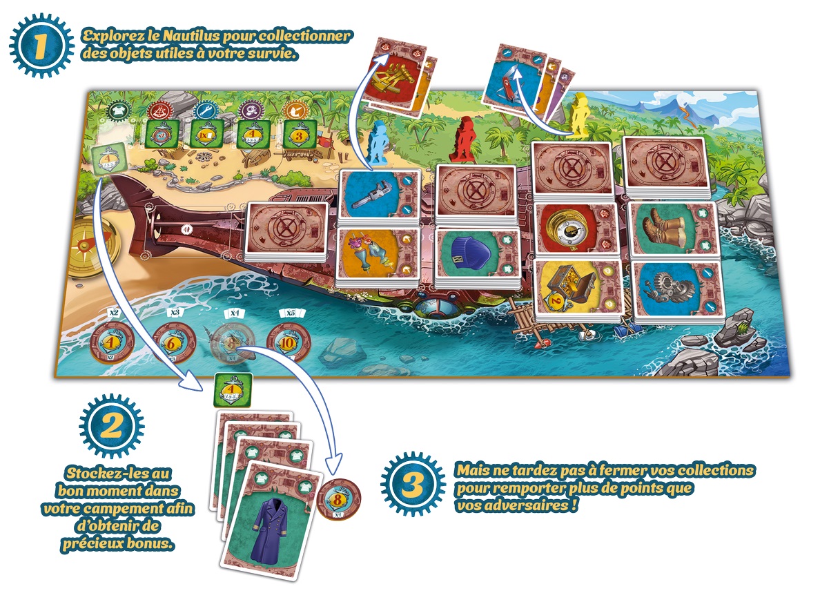 Vous êtes des naufragés sur une île mystérieuse, déserte et volcanique. Après une tempête, vous tombez sur un sous-marin échoué et vide de son équipage : le Nautilus. Vous devrez en explorer les différents recoins pour récupérer le plus d’objets afin d’assurer votre survie et remettre en état le sous-marin pour quitter l’île avant les autres naufragés.