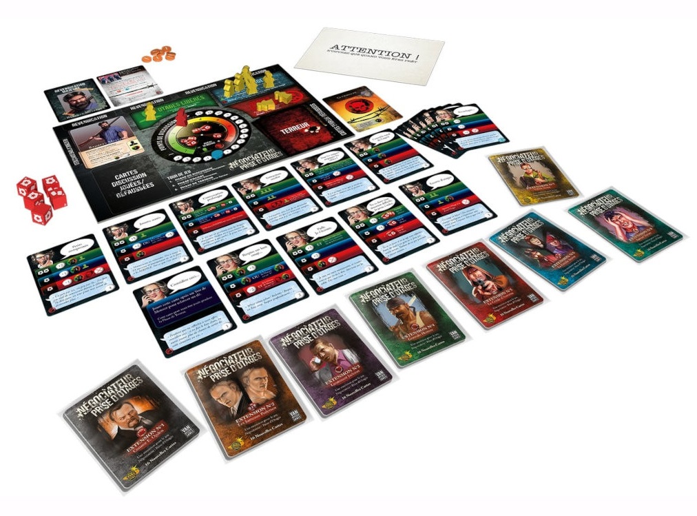 CONTENU: 1 grand plateau Négociateur, 14 situations de prises d’otages, 5 dés spéciaux, 20 pions Otage et autres marqueurs en bois, 255 cartes au total DONT : 2 sets de cartes Discussion différentes, 42 cartes Terreur de base, plus de 30 cartes Terreur spécifiques, 12 cartes Événement Crucial et 30 séparateurs pour les trier !