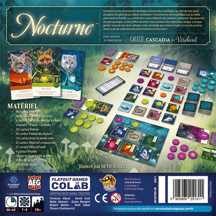 Dans Nocturne , vous incarnez un renard mystique qui lance des sorts magiques pour collecter un assortiment d’objets enchantés. Vous affrontez des mystiques rivaux, chacun d’entre vous décidant du moment où lancer les sorts les plus puissants pour se déplacer dans la forêt avec la plus grande ruse afin de sécuriser la meilleure collection. À chaque tour, vous décidez quels objets sont les plus précieux pour vous et quand retenir les autres mystiques.