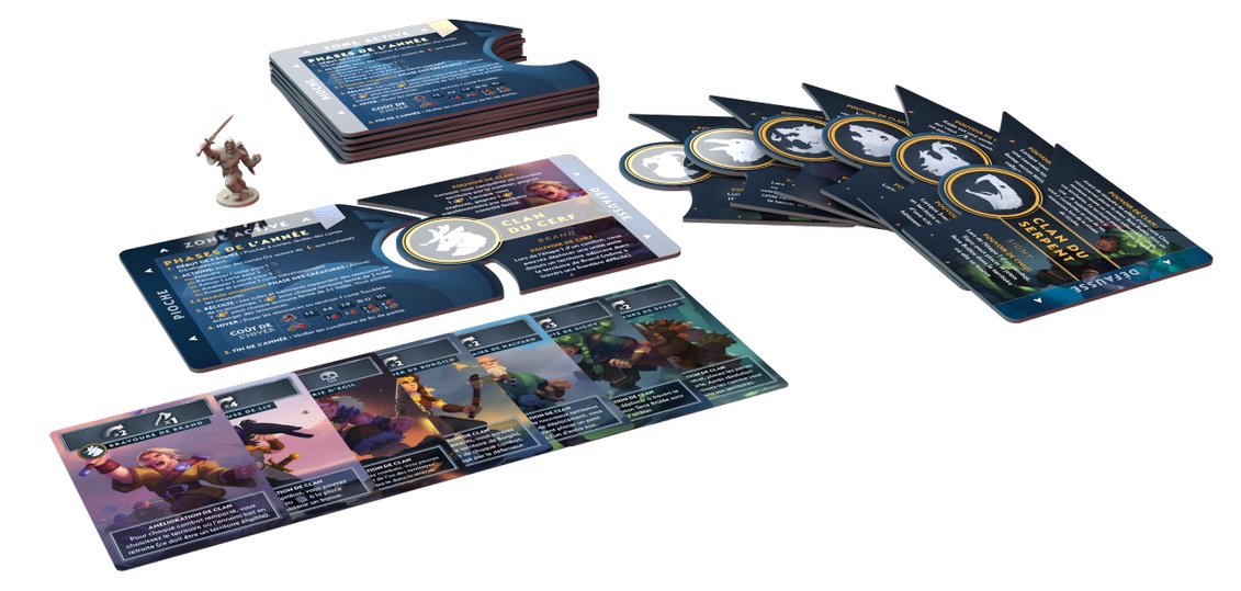 La miniature Kaija, les plateaux modulaires Joueur et Clan et les nouvelles cartes d’amélioration de Clan peuvent être intégrés à vos jeux de base de Northgard : Uncharted Lands, sans nécessiter d’autres matériaux du module Warchiefs.