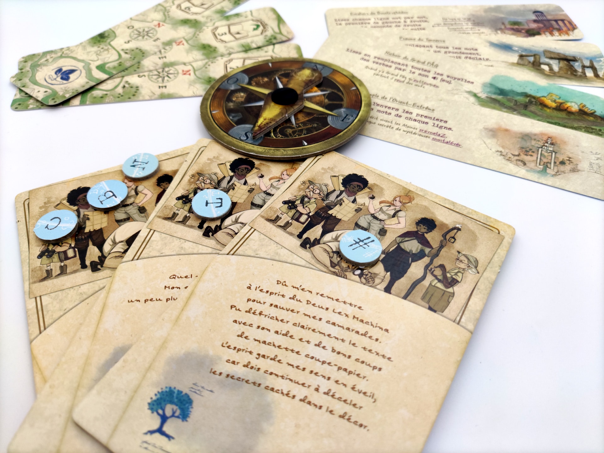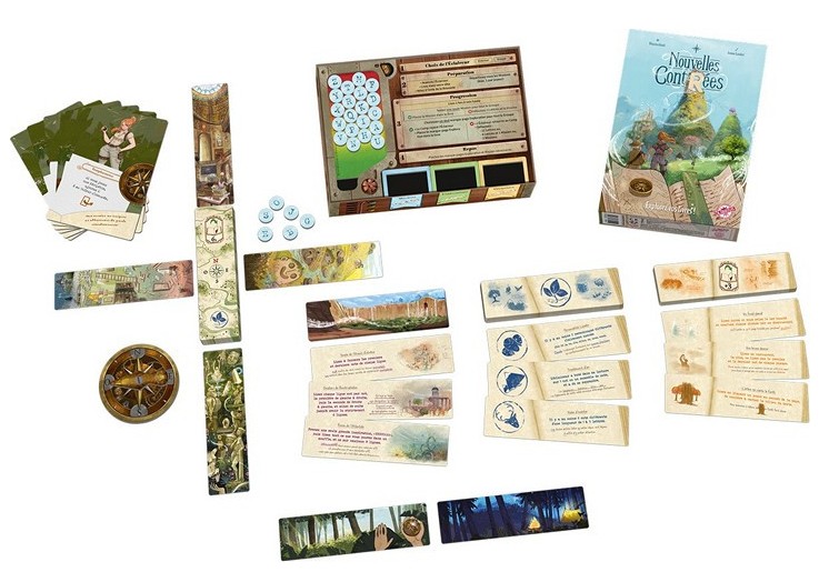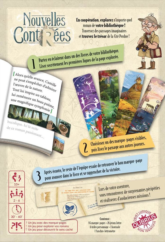 Contenu: 84 marque-pages, 26 jetons lettres, 6 tuiles personnages, 1 boussole, 1 Synchro-lettromètre, 1 livret de règles.