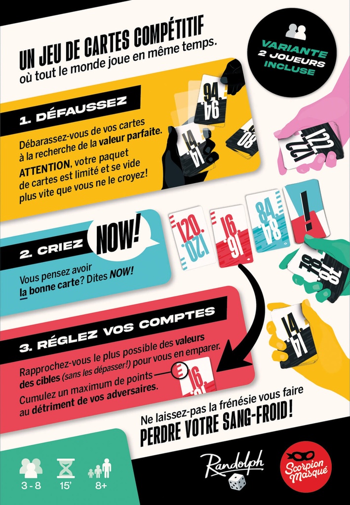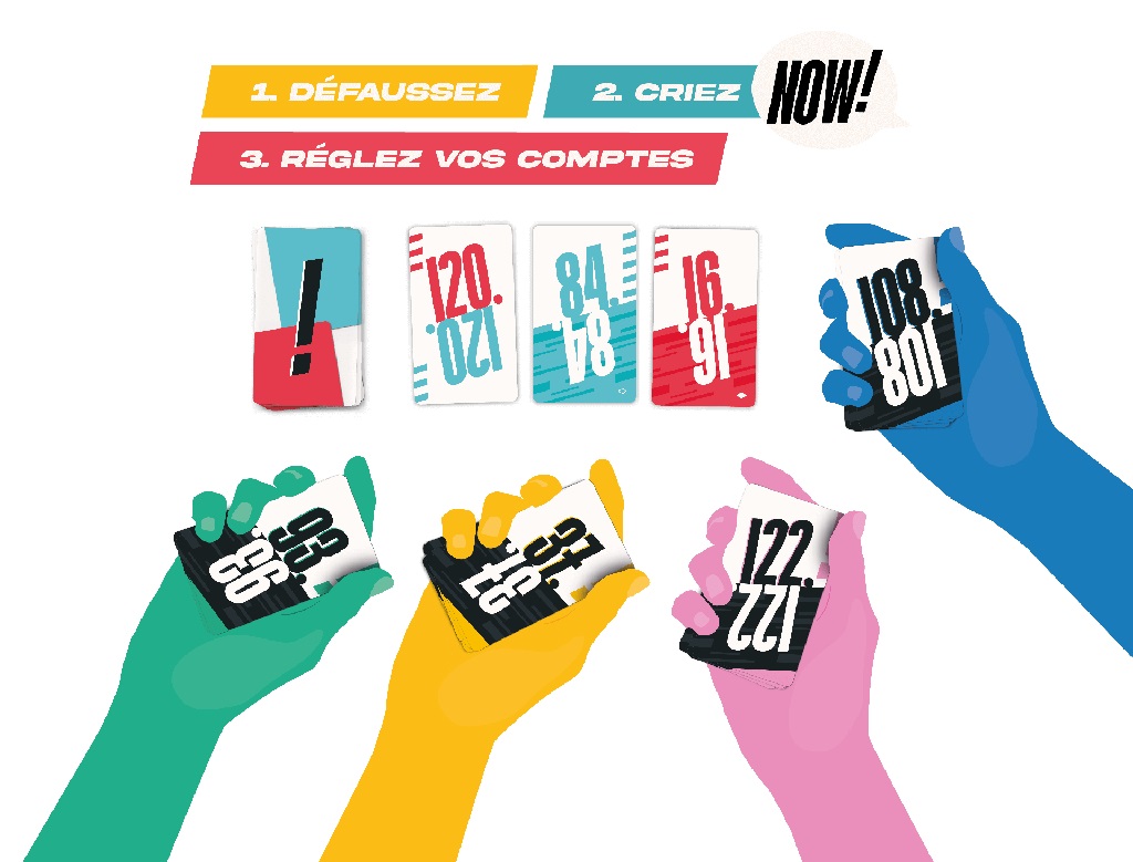 Défaussez vos cartes le plus vite possible à la recherche de la valeur parfaite. Attention, votre paquet de cartes est limité et se vide plus vite que vous ne le croyez ! Vous pensez avoir la bonne carte ? Criez NOW !