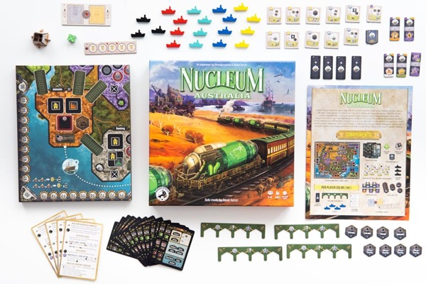 Nucleum : Australie s’accompagne d’une nouvelle carte qui introduit plusieurs nouveaux concepts et changements de règles dans le jeu de base Nucleum. Utilisez les voies maritimes pour étendre vos réseaux, construisez vos propres mines de charbon et essayez la variante expert en faisant des offres pour les expériences.