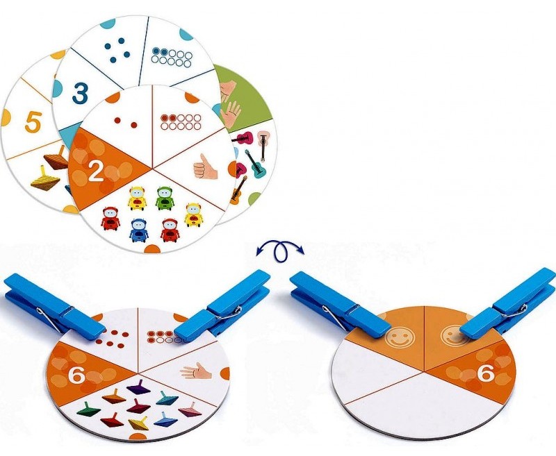 Un jeu simple et ludique sur les chiffres et les quantités. La carte « défi » propose différentes représentations de quantité : chiffres, schèmes, constellations, doigts de la main ou dessins. L’enfant doit retrouver parmi les propositions celles qui correspondent à la case colorée. Il pince ses réponses et retourne la carte pour voir si elles sont correctes.