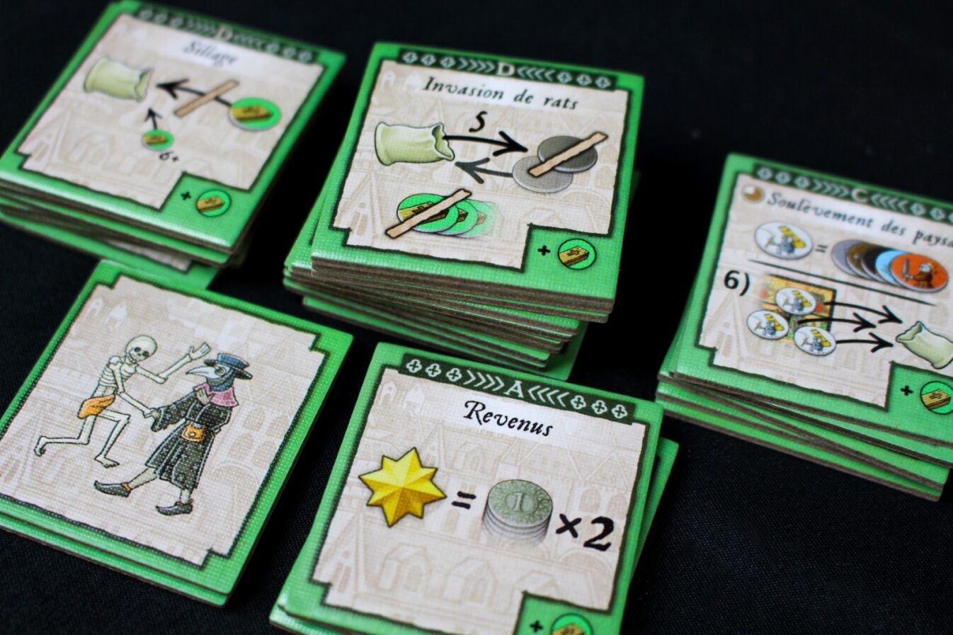 Pour s’en débarrasser définitivement, un joueur peut remplir des cartes d’indulgence par le biais de pèlerinages, de dons ou d’autres conditions, qui rapportent également des points de victoire à la fin de la partie. Heureusement, chaque joueur dispose d’un « médecin de la peste », un nouveau personnage disponible à chaque tour (ou presque) et utilisable de manière universelle.
