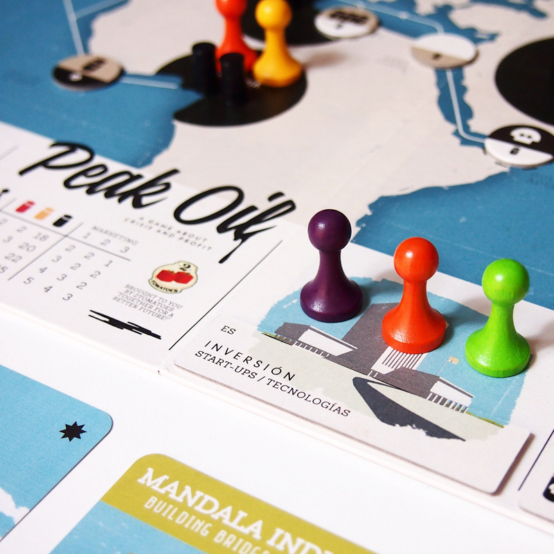 Après un certain temps, le pétrole, représenté par des barils que vous piochez depuis un sac quand vous développez de nouveaux champs pétroliers, s’épuisera. C’est le pic pétrolier, mais aussi la fin de la partie. Les joueurs font la somme des technologies dans lesquelles ils ont investi et qu’ils ont promues.