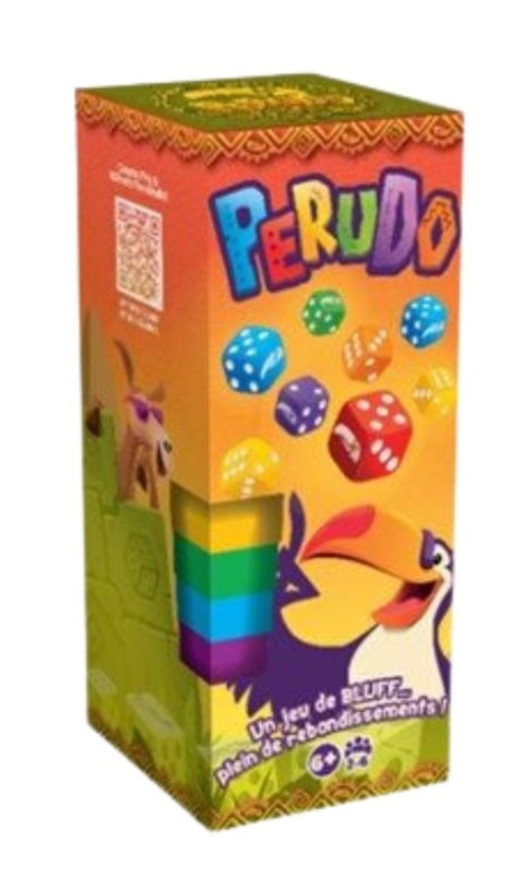Dans ce jeu de pari et de bluff, chaque joueur reçoit un set coordonné composé d’une tasse et de cinq dés.