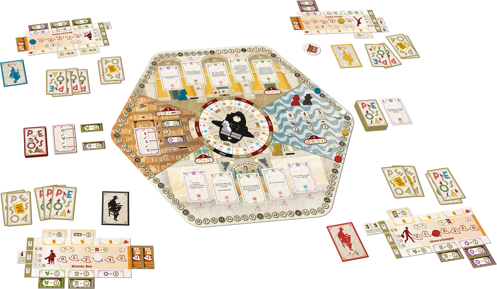 Pessoa est un jeu de pose d’ouvrier pour 1 à 4 joueurs, à la fois stratégique et léger, et au thème aussi original que plaisant.