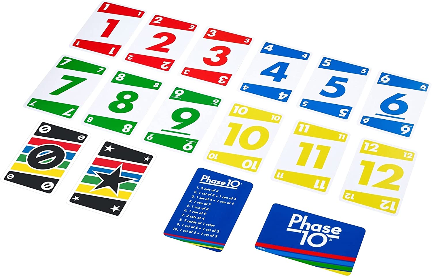 Le but de la phase 10 est d’être le premier joueur à obtenir dix phases variées avec deux séries de trois, une série de sept ou sept cartes de la même couleur. Il existe également deux cartes spéciales. Les jokers peuvent être utilisés comme carte de couleur pour terminer une phase. Il y a aussi des cartes Skip qui forceront un autre joueur à perdre un tour.