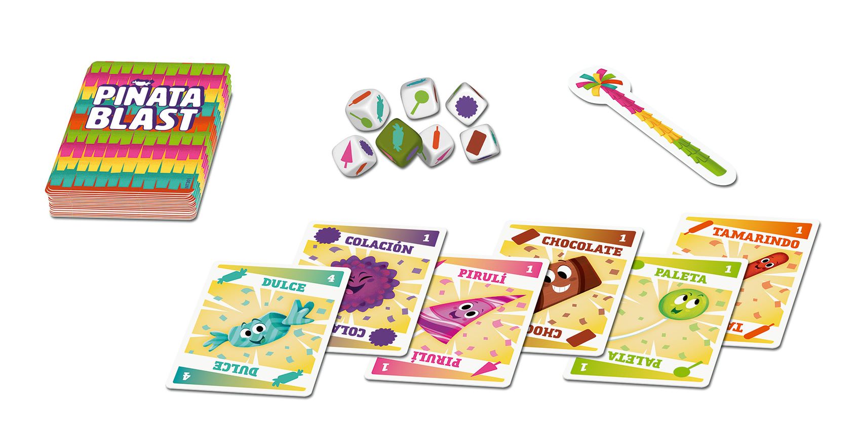 Contenu: 72 cartes, 7 dés, 1 jeton de Piñata, Instructions.