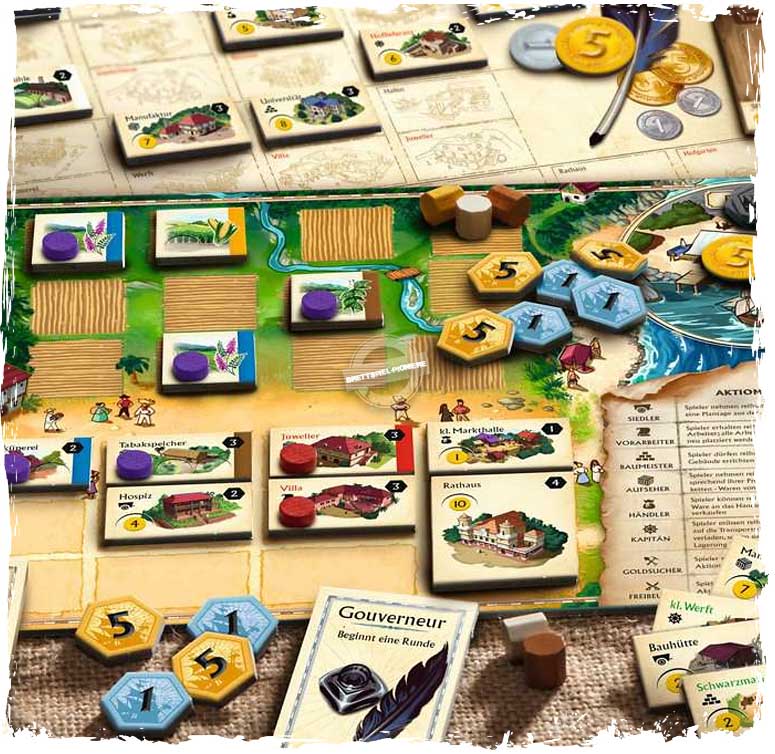 Contenu: 6 plateaux de jeu, 50 marchandises, 100 ouvriers, 20 bourgeois, 5 navires, 51 pièces, 58 tuiles Terrain, 50 jetons point de Victoire, 10 cartes Personnages, 91 tuiles Bâtiments, 1 règle de jeu