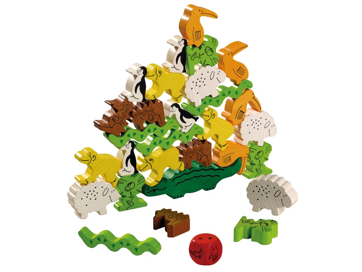 Les joueurs essaient d’empiler tous leurs animaux sur la pyramide dont le crocodile est la base.