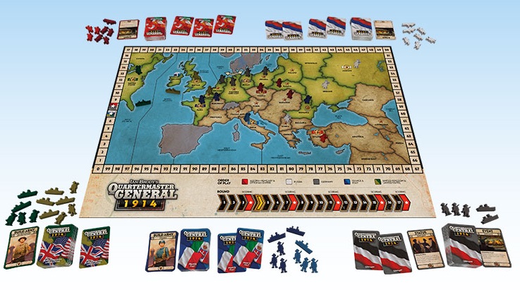 Quartermaster General : 1914 est un jeu au rythme effréné qui oppose les puissances centrales d’Allemagne, d’Autriche-Hongrie et de l’Empire ottoman aux puissances de l’Entente de Russie, de France, d’Italie, du Royaume-Uni et des États-Unis. Basé sur le système populaire Quartermaster General, ce jeu de guerre piloté par des cartes reflète l’intrigue militaire, économique et politique de l’époque.