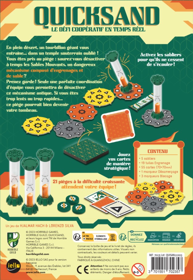 Retourner un sablier trop tôt, c’est risquer de s’attirer des ennuis… mais si vous attendez trop longtemps, vous n’aurez aucun moyen de vous échapper. Vous devrez faire preuve de stratégie et de coordination pour que votre équipe désactive les Sables Mouvants avant que les sabliers ne s’épuisent !