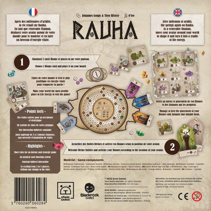 Obtenez le plus de points de victoire, représentés par l’énergie vitale, pour gagner la partie. Vous avez 2 âges pour transformer votre monde en un noyau énergétique de Rauha. À l’âge 1, la végétation, le terrain et la faune apparaîtront. Dans l’âge 2, les civilisations prospéreront.