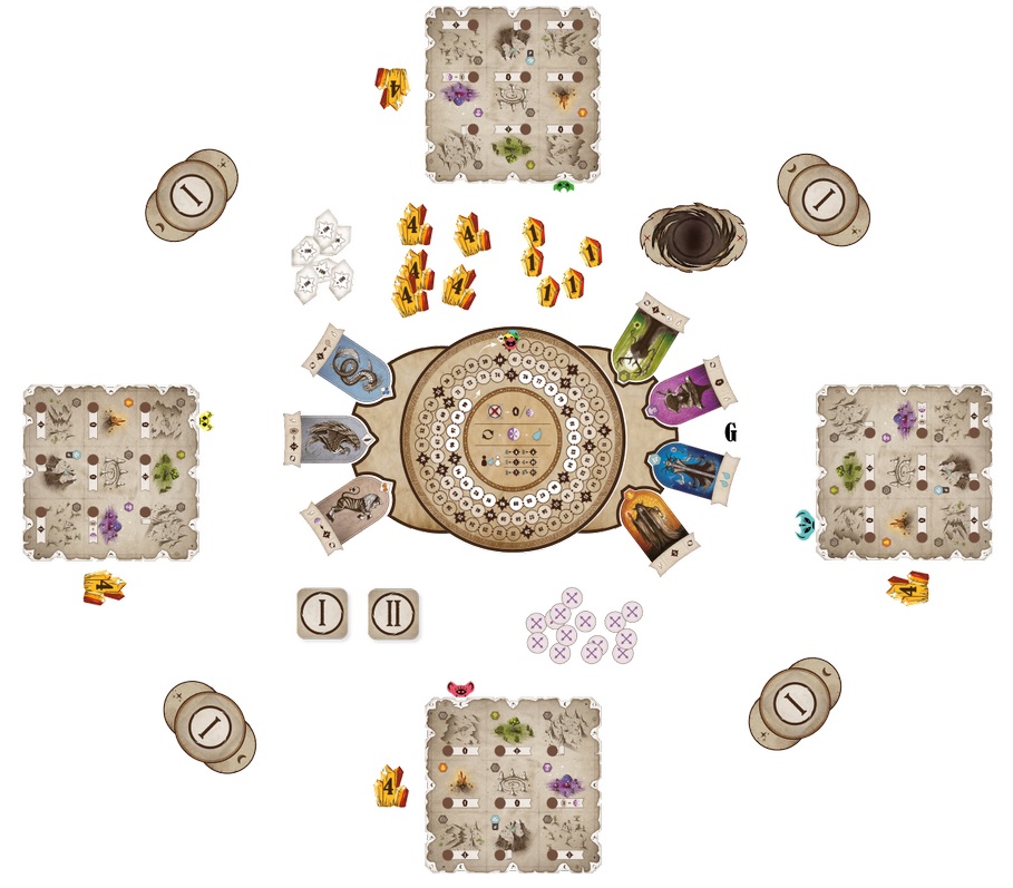Lors de chaque manche, 4 cartes Biome vont être placés entre chaque personne. Prenez le paquet de carte à votre gauche ou à votre droite, selon la position de votre avatar, et choisissez-en une. Dans le sens horaire en débutant par la personne qui a le plus de points d’Energie, chacun et chacune place sa carte sur sa grille en payant le cout éventuel et active tous les Biomes présents dans la colonne ou la ligne en regard de son avatar. Déplacez ensuite votre avatar dans le sens horaire. L’alignement des types de Biomes et Animaux présents sur les tuiles, vous permettront d’accueillir des divinités aux pouvoirs uniques !
