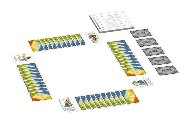 Contenu : 10 cartes Pouvoirs de Princesses, 12 cartes Fées (jaunes, de 1 à 12), 12 cartes Princes (bleues, de 1 à 12), 21 cartes de Manche, 12 cartes Reines (rouges, de 1 à 12), 12 cartes Animaux (vertes, de 1 à 12, y compris la Grenouille de valeur 8), 1 Bloc de Score, 1 règle du jeu.