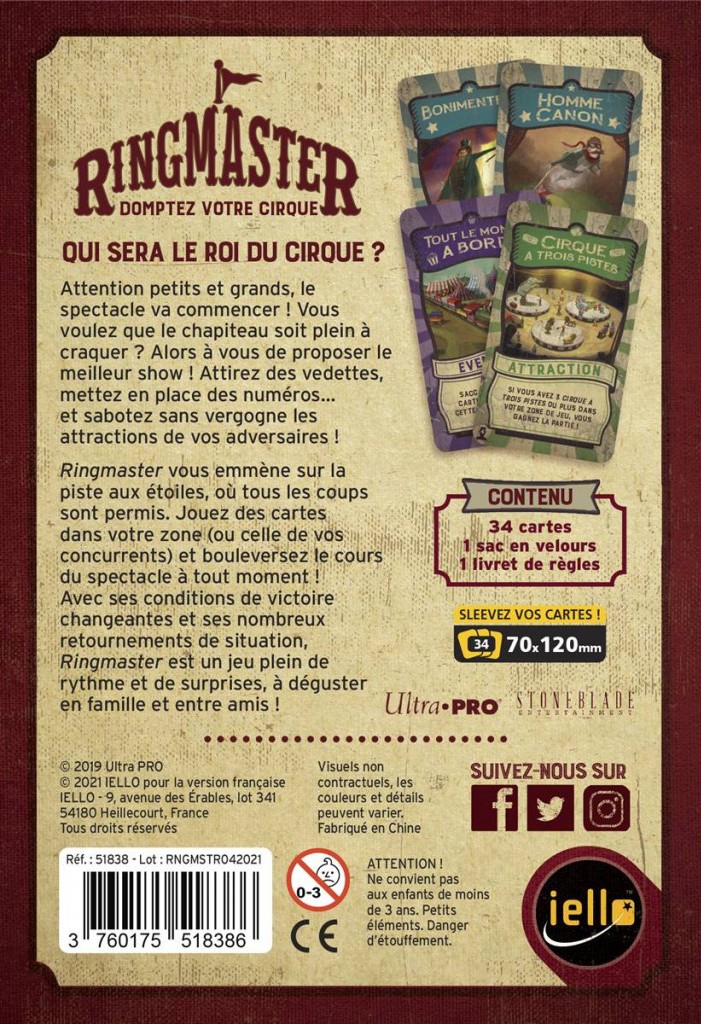 Ringmaster vous emmène sur la piste aux étoiles, où tous les coups sont permis. Jouez des cartes dans votre zone (ou celle de vos concurrentes) et bouleversez le cours du spectacle à tout moment ! Avec ses conditions de victoire changeantes et ses nombreux retournements de situation, Ringmaster est un jeu plein de rythme et de surprises, à déguster en famille et entre amis !