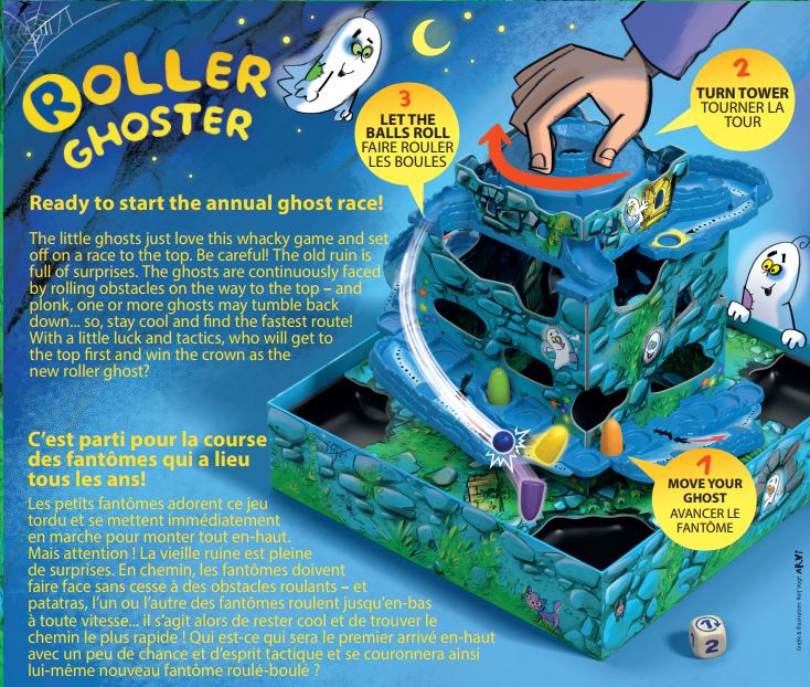 De la ligne Drei Magier de Schmidt, Roller Ghoster enseigne aux enfants la gestion des risques en utilisant un mécanisme similaire à Fireball Island. Les joueurs peuvent choisir la piste intérieure au fur et à mesure qu’ils courent vers le haut, ce qui est plus long mais beaucoup plus sûr des objets volants. Ou, les joueurs choisissent la piste extérieure qui est un chemin plus rapide vers le sommet – mais un risque beaucoup plus élevé d’être touché par un objet volant et de les renvoyer au début.