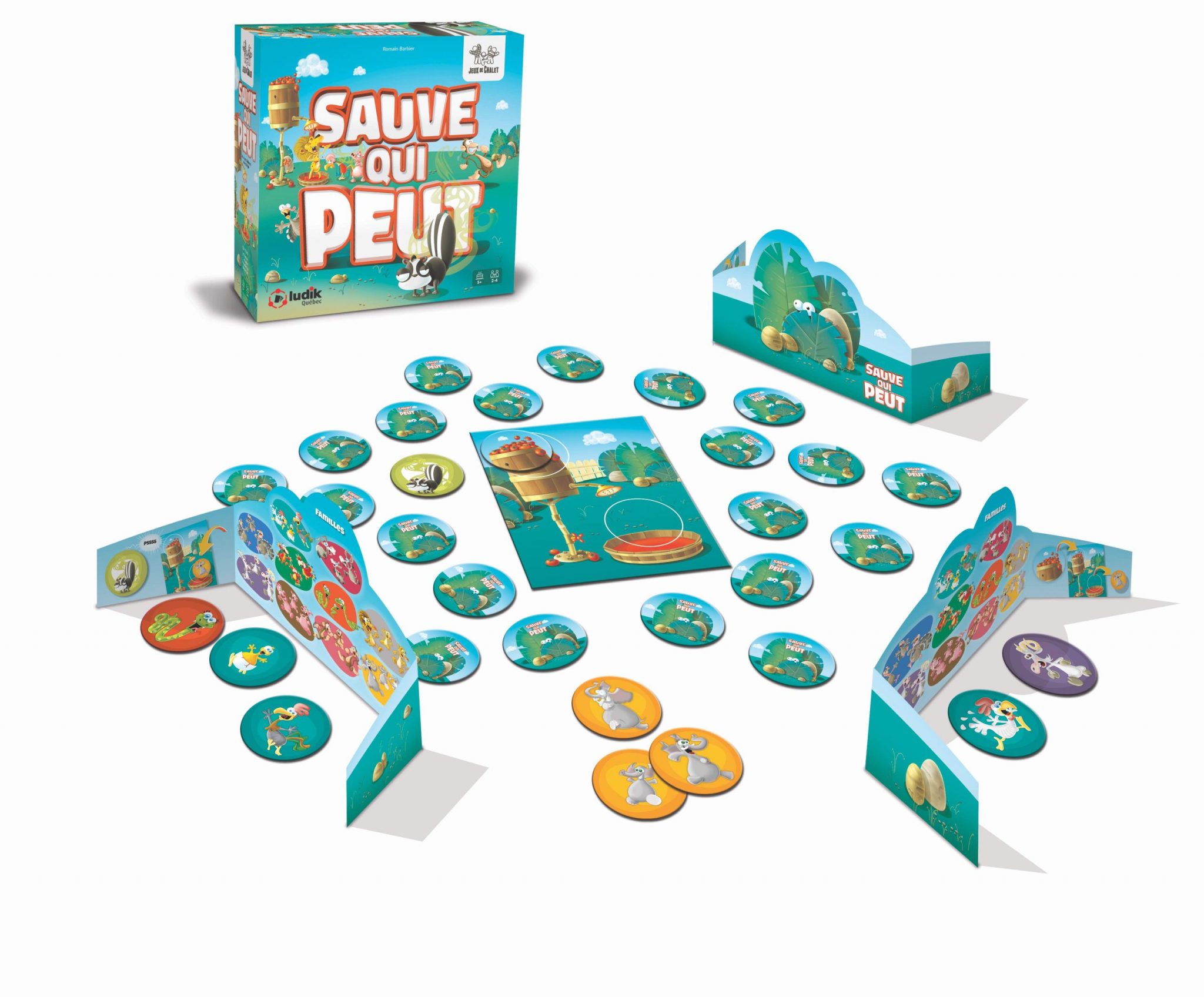 Imite le cri de ceux qui se trouvent dans ta cachette et tente de retrouver où se cache leur famille. Fais attention : si la moufette d’un adversaire arrose tes animaux, ils devront passer sous la douche et un autre joueur en possession du jus de tomate pourra les prendre.