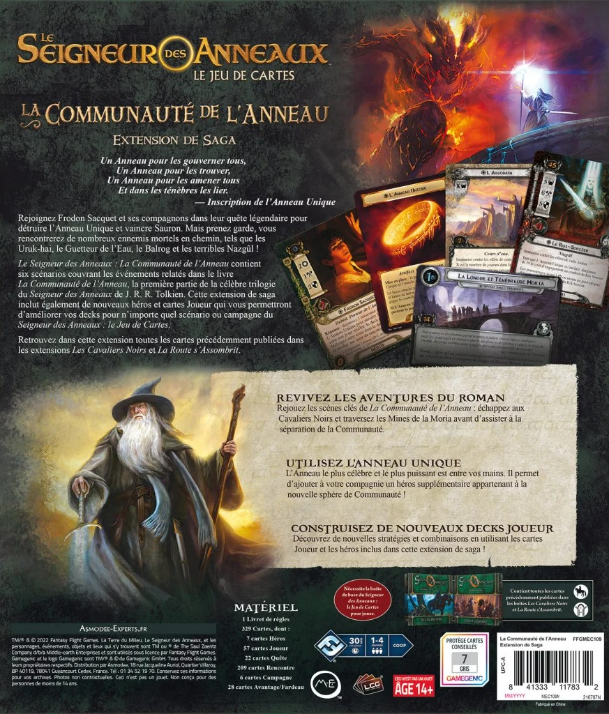 Découvrez le début du voyage pour détruire l’Anneau Unique dans l’extension The Fellowship of the Ring Saga pour Le Seigneur des Anneaux : Le Jeu de Cartes ! Cette extension contient six scénarios recréant les aventures du premier volet de la légendaire saga Le Seigneur des Anneaux. Vous trouverez également plus de 50 cartes de héros et de joueurs, qui peuvent être utilisées pour construire ou améliorer vos decks pour n’importe quel scénario ou campagne Le Seigneur des Anneaux : Le Jeu de Cartes !