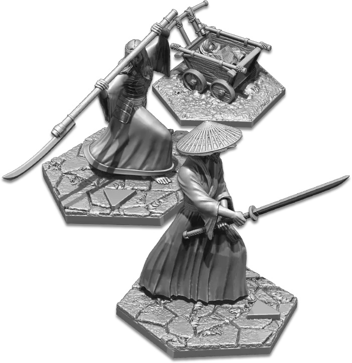 Ce pack de personnages contient deux figurines de 32 mm (Onna-Bugeisha et Yojimbo) et 104 cartes de capacités comprenant les cartes signatures de chaque personnage, des arbres de kamae, de nouvelles cartes de capacités de base et leurs propres jeux de solos uniques.